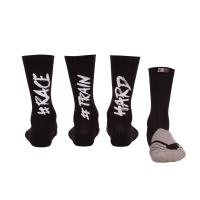 The new Z3R0D triathlon socks come as three odd socks: one that you keep on your right foot - featuring the hashtag #hard behind your calf and two others that you can wear alternatively depending on the occasion, whether you are racing or training, featuring #race or #train behind the calf. Adjust your gear to your triathlon experience!